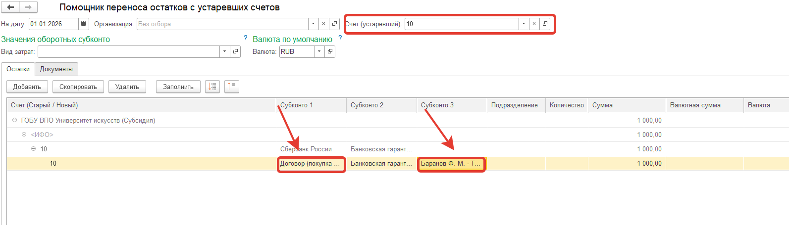 В БГУ 2.0 необходимо осуществить перенос остатков с устаревшего счет 10 на новый и заполнить аналитику по субконто 1 "Договоры и иные основания возникновения обязательств" и по субконто 3 "Центры материальной ответственности".