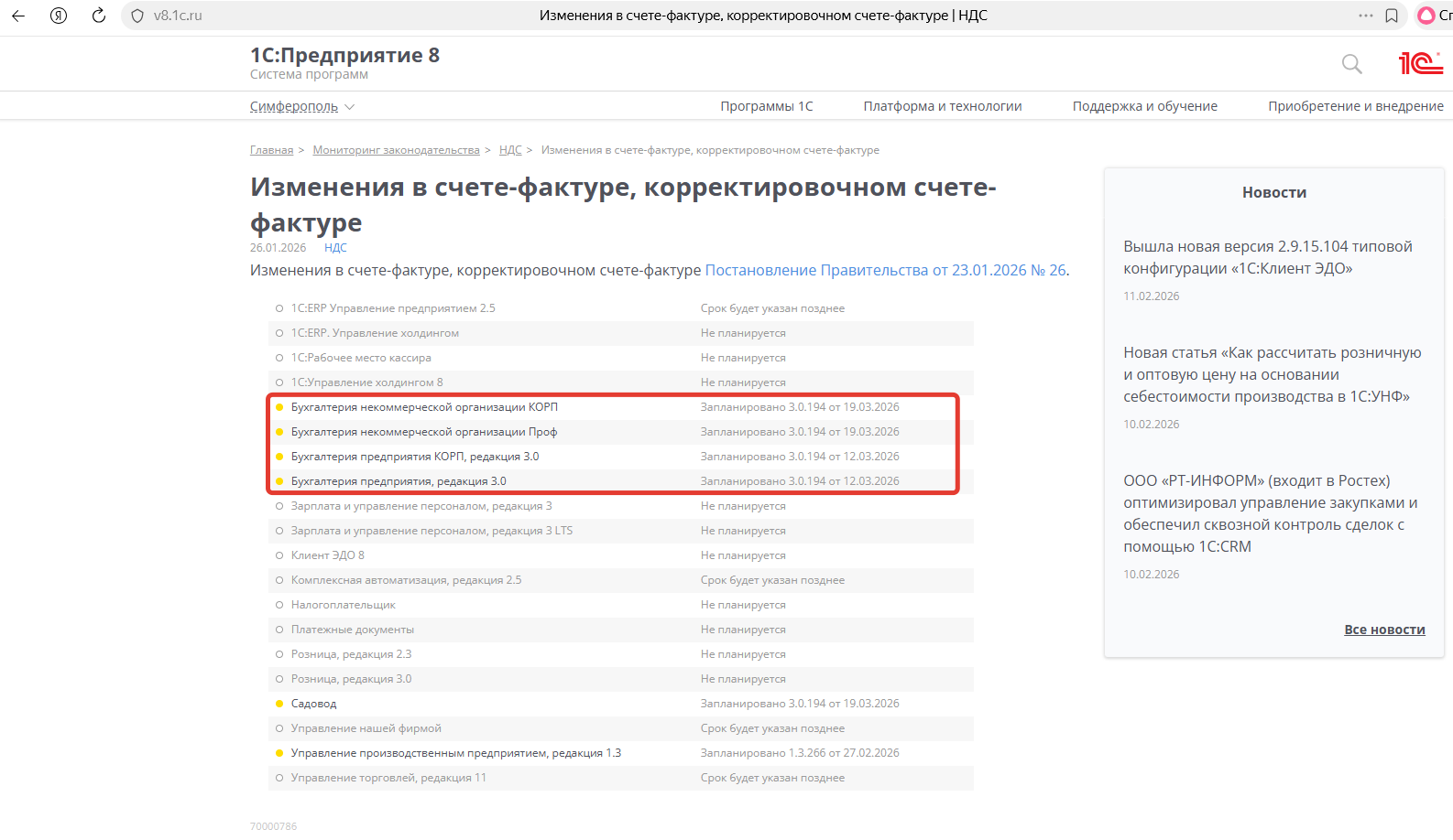 Обновили программу, а форма УПД осталась старая. Когда в программе будет реализована новая форма по Постановлению Правительства № 26 от 23.01.2026 г.?