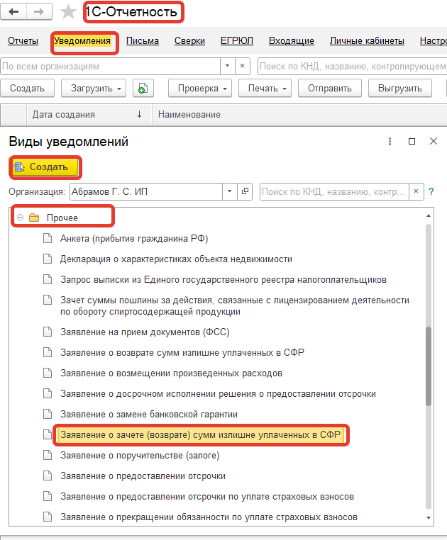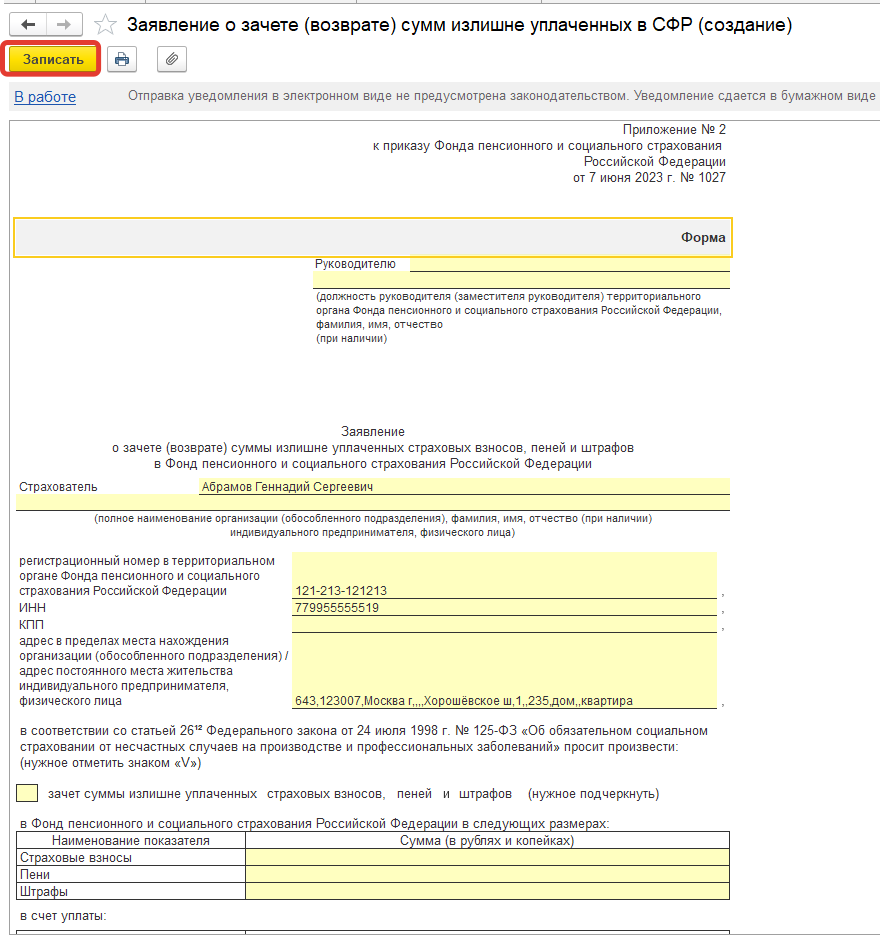Можно ли из Бухгалтерии предприятия 3.0 отправить в СФР Заявление о зачете(возврате) суммы излишне уплаченных страховых взносов, формируется ли такой документ?