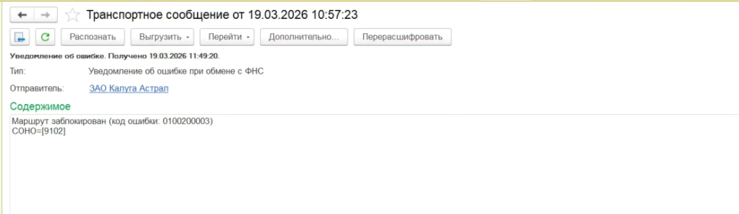 Ошибка при отправке Отчета по налогу на прибыль в ИФНС 9102 "Маршрут заблокирован (код ошибки: 0100200003) СОНО=[9102]"