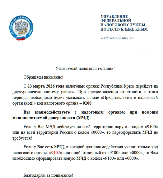 Добрый день, получили такую информацию от налоговой : Начиная с 23.03.2026 на титульном листе налоговой отчетности при заполнении графы «Код налогового органа, в который представляются налоговая отчетность», следует указывать код налогового органа – 9100. Нужно ли что-то делать с доверенностью на отчетность?