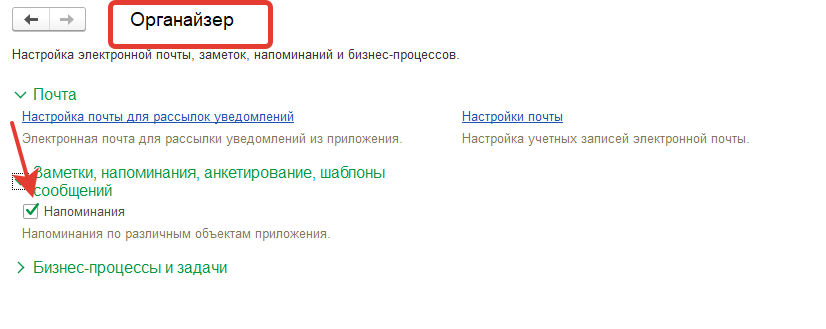 В разделе Администрирование - Органайзер установлен флажок Напоминания.