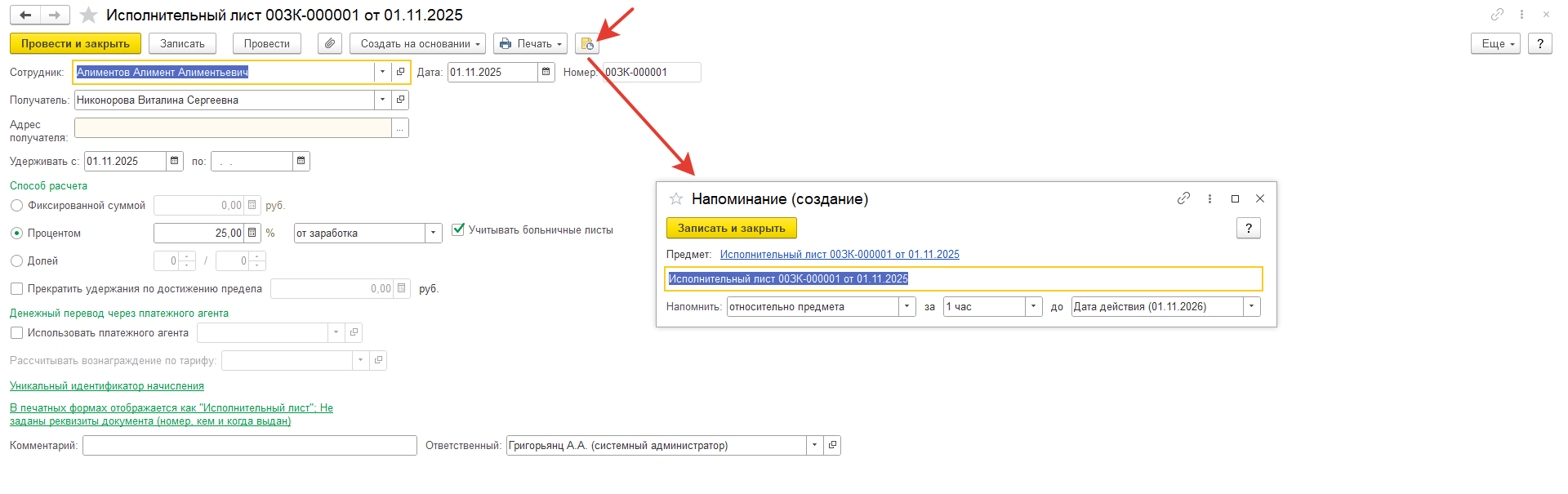 Как в ЗУП 3.1( ЗКГУ 3.1) установить напоминание себе на конкретную дату по документу, к примеру Исполнительный лист?