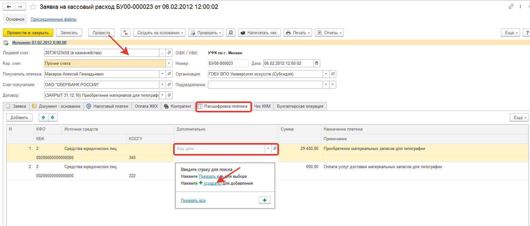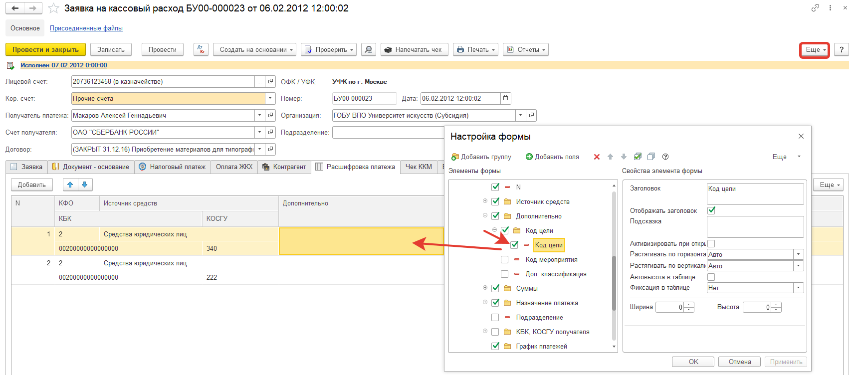 Где в БГУ 2.0 в документе Заявка на кассовый расход добавить реквизит Код цели получателя, чтобы эти данные выгружались в СУФД?