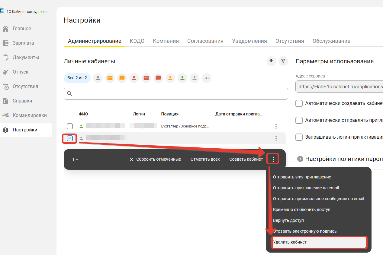 2. Принудительное удаление в кабинете администратора сервиса (установить флаг, выполнить команду Удалить кабинет)