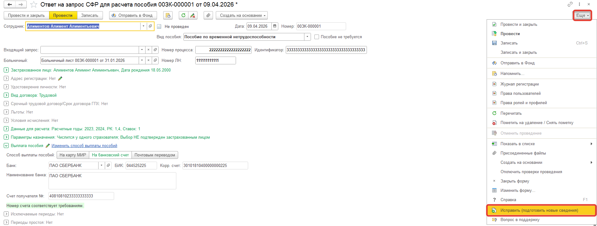 1. Открыть ранее отправленный ответ на запрос СФР для расчета пособия и через Еще выбрать Исправить(подготовить новые сведения), в котором обязательно указать номер и дату извещения и в комментариях подтвердить доход: