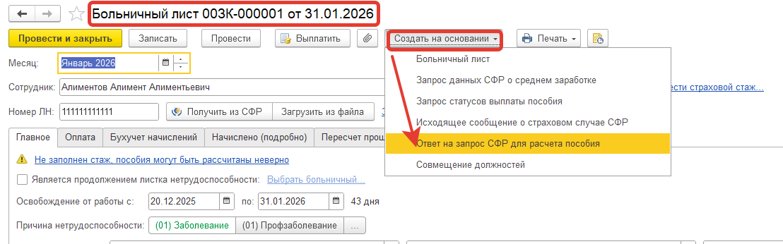 3. Открыть документ Больничный лист и на его основании создать Ответ на запрос СФР для расчета пособия: