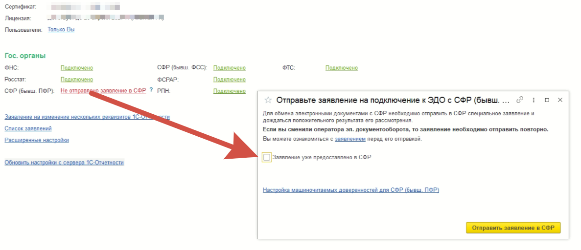 Ранее отправляли "Заявление на подключение ЭДО к СФР" -ответ не поступает, статус не меняется, и когда пробуем выслать отчет, то показывает предупреждение - "Внимание! Отправляемый отчет может быть не принят Отправляемый отчет может быть не принят, поскольку заявление на подключение обмена эл. документами с СФР еще не обработано СФР Для обмена электронными документами с СФР необходимо дождаться положительного результата рассмотрения заявления. Отслеживайте состояние обработки в форме этого заявление"