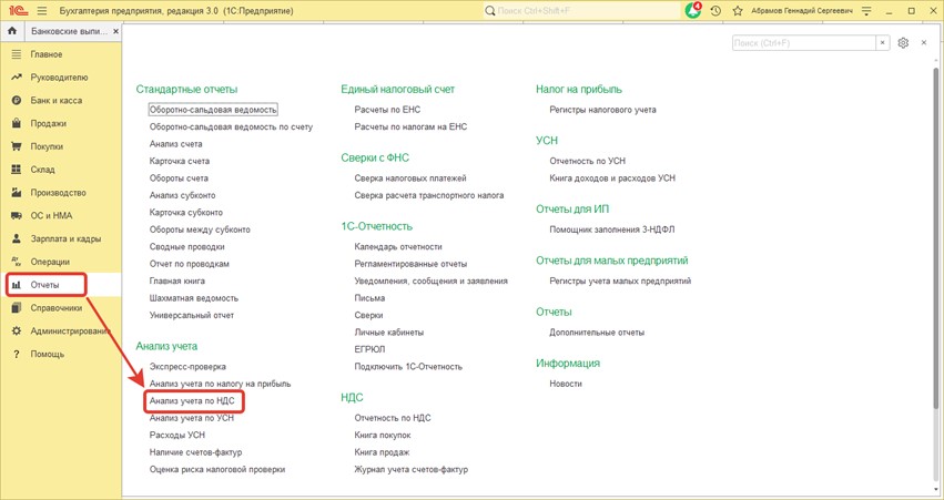 Отчет «Анализ учета НДС» находится в подсистеме «Отчеты»: