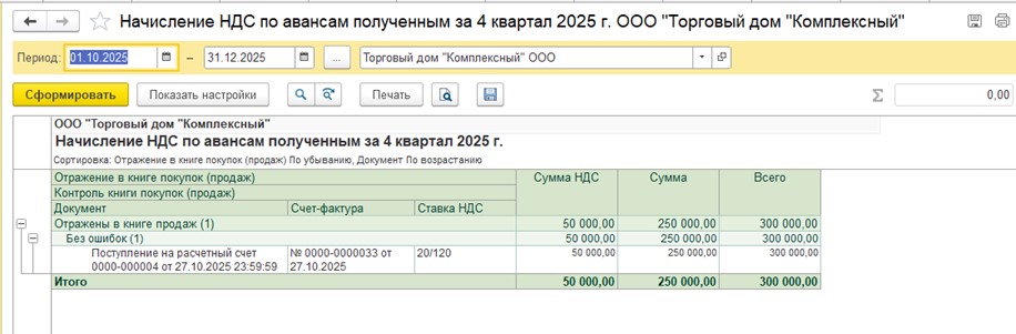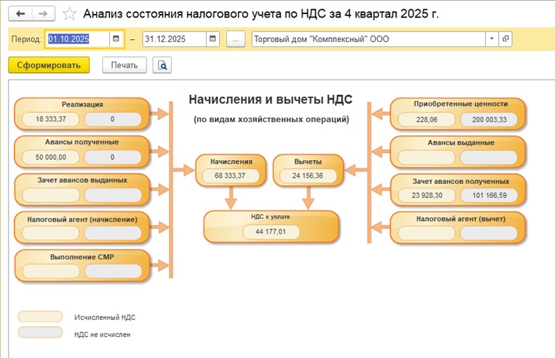 В части НДС с авансов отчет покажет документы авансов, по которым отсутствуют сформированные счета-фактуры на аванс.