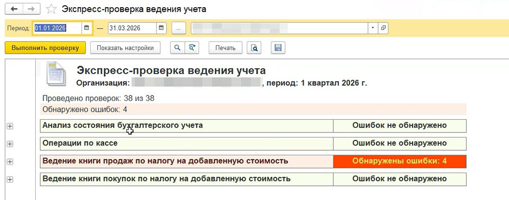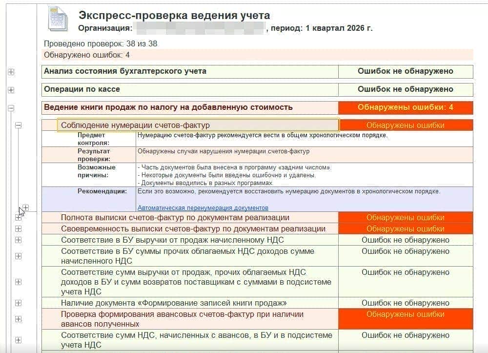 Для проверки корректности авансовых счетов-фактур и обнаружения других ошибок формируем отчет «Экспресс-проверка» («Отчеты» – «Анализ учета» – «Экспресс-проверка»). Отчет покажет, в каких направлениях учета есть ошибки.