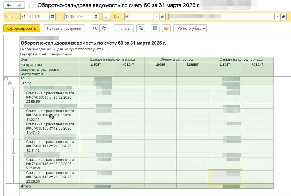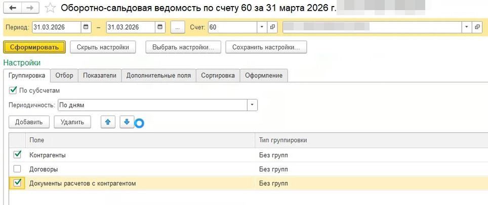 Сначала проверяем, что собрали всю первичную документацию от поставщиков. Для этого формируем ведомость по счету 60 по состоянию на последний день месяца. «Отчеты» – «Стандартные отчеты» – «Оборотно-сальдовая ведомость по счету». Для простоты анализа можно поставить галочку в поле «Документы расчетов с контрагентами».
