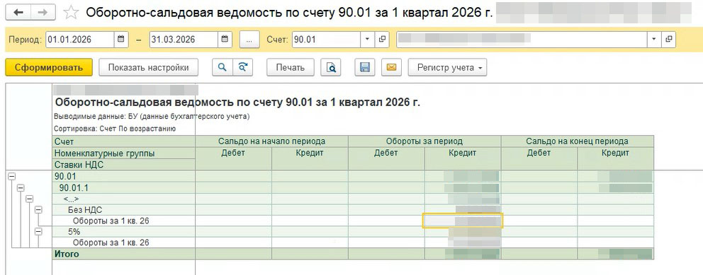 Если у организации есть операции, которые НДС не облагаются, необходимо проверить корректность ставок. Чтобы это сделать, формируем ведомость по счету 90.01. В «Настройки» – «Группировка» обязательно проставляем галочку возле поля «Ставки НДС». В качестве периода задаём весь квартал.