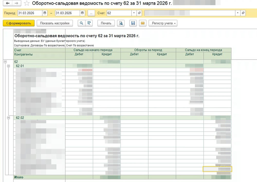 После закрытия периода нужно проверить счета 60 и 62 на наличие двойного сальдо по одному и тому же контрагенту. Для этого проверяем, нет ли на счетах сальдо, отмеченных красным, и нет ли на разных счетах (например, 62.01 и 62.02) сальдо по одному контрагенту.