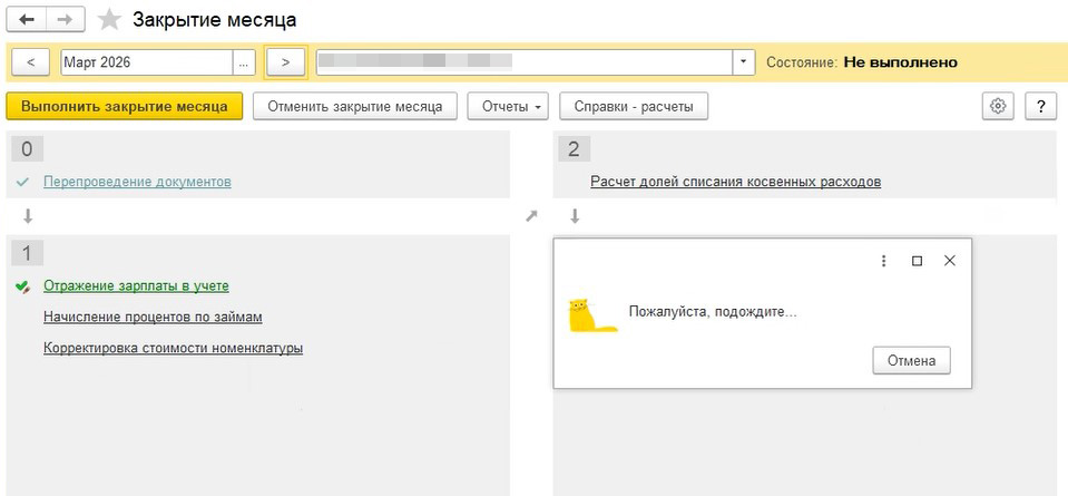 Чтобы документы перепровелись и взаиморасчеты встали в корректную форму, нужно закрыть период. «Операции» – «Закрытие периода» – «Закрытие месяца». Выбираем последний месяц квартала и нажимаем «Выполнить закрытие месяца».